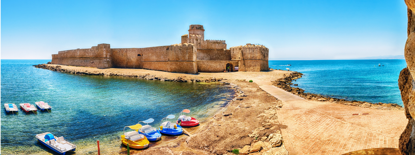 Un tardo pomeriggio escursione con nostro pullman a Le Castella: noto centro turistico nella provincia di Crotone, conosciuto principalmente per la fortezza e le scogliere ricche di reperti archeologici greco-romani. Il castello (ingresso gratuito) sorge in un vero e proprio isolotto, legato alla costa solo da una striscia di terra; è stato edificato nel XV secolo ed è stato totalmente restaurato. Nel suo interno è possibile trovare i resti di un antico borgo con una chiesetta e una cappella, i bastioni panoramici e la torre.